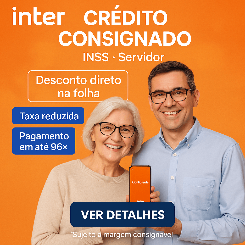 O consignado Inter combina taxas competitivas (a partir de 1,50 % ao mês), contratação 100 % digital e opção de portabilidade com troco. Se você é aposentado, pensionista ou servidor e quer pagar menos juros sem sair de casa, simule no app Inter, compare o CET e só confirme se a parcela couber no seu orçamento. Pagando menos, sobra mais para aproveitar a vida ou investir no que importa.